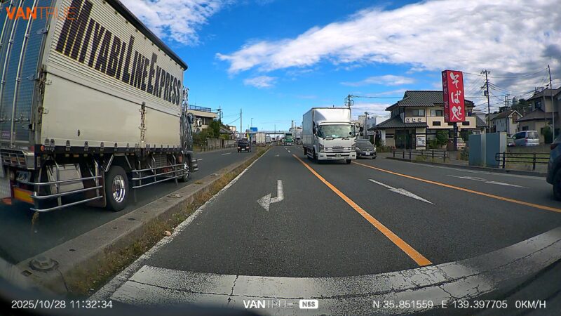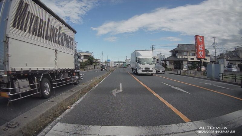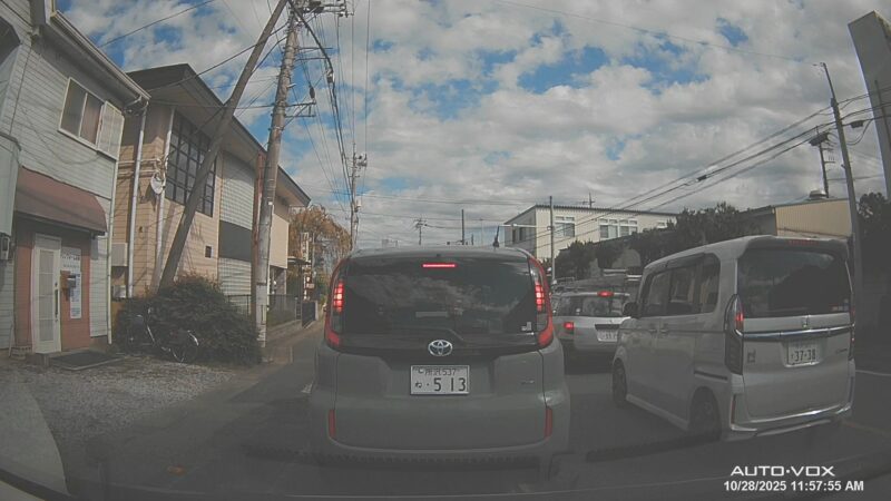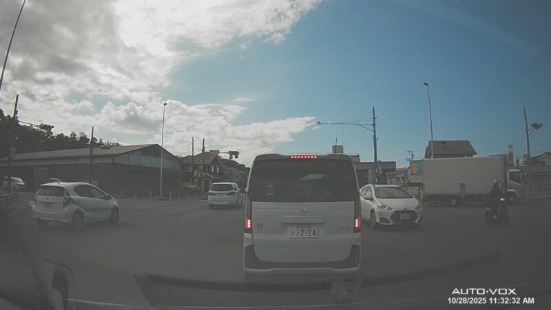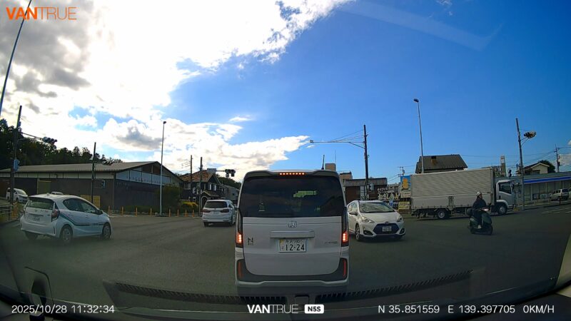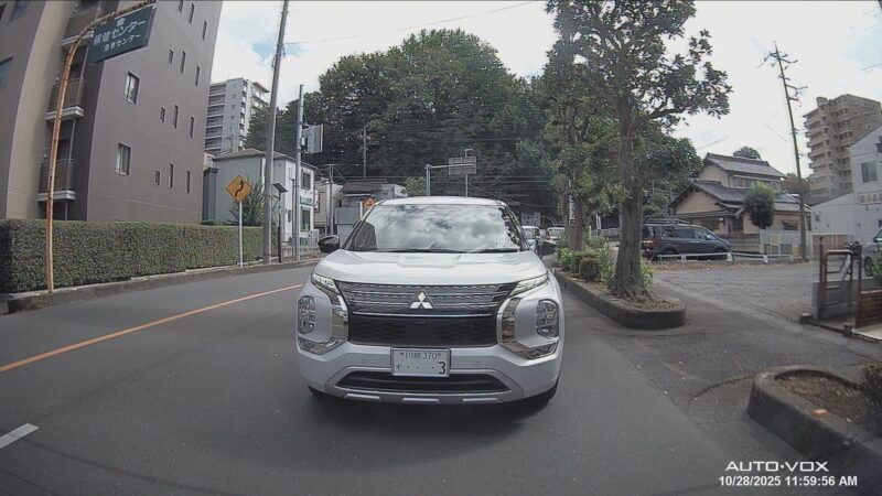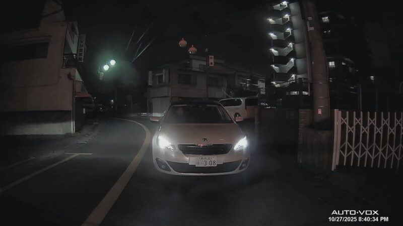 夜間は、前方カメラの収録動画に白飛びが見られ、ヘッドライトを照らしている状況では、前方車両のナンバー認識は出来ませんでした。