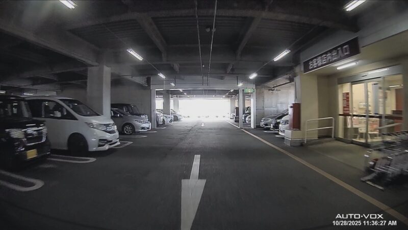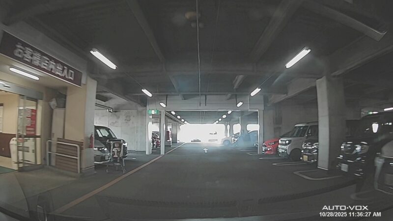 光が差し込む駐車場の出入口が白飛びしており、外側の様子は目視する事が出来ませんでした。