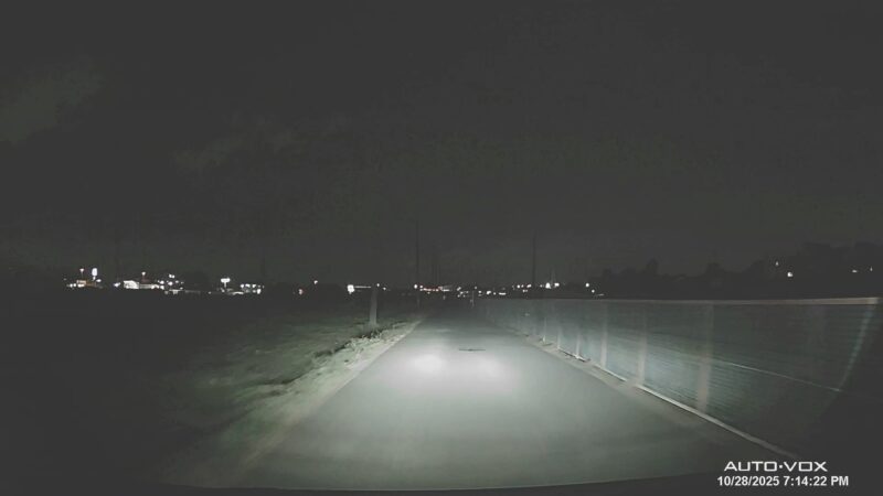街灯が非常に少ない農道では、前後カメラ共に一般的なドラレコと大差はなく、光源がない場所では黒潰れが見られました。