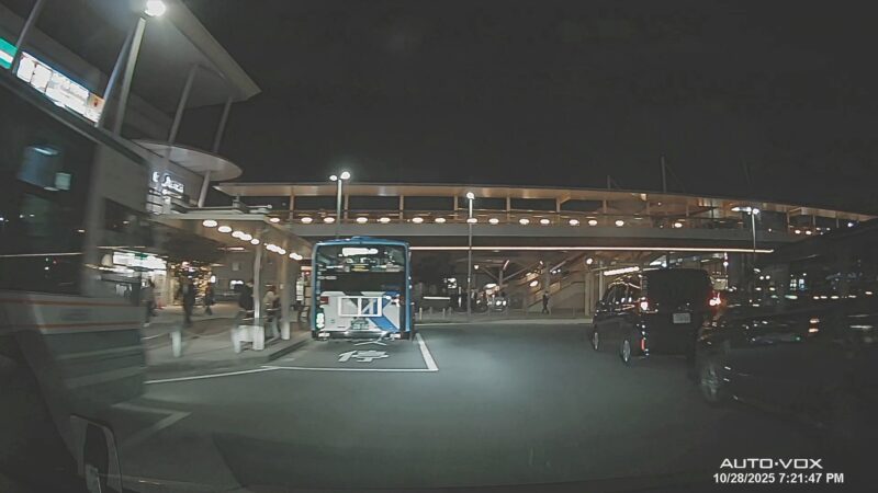 駅前ロータリー付近の明るい通りでは、後方の視界はしっかりと映し出されていました。ただ、映像の色彩が白黒っぽく、全体的にモノクロっぽい印象を受けました。