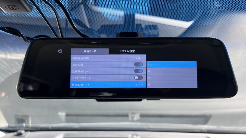 駐車監視モードは衝撃検知モードのみとなり、感度設定は高・中・低と3段階で設定が可能。