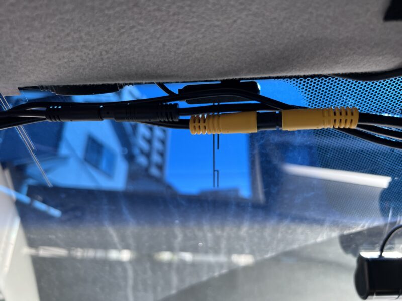 ミラー本体と駐車監視ケーブルを繋ぐ黄色のコネクターとミラー本体とフロントカメラを繋ぐ黒いコネクターは、助手席側左上のルーフライニング裏に隠して配線を這わせました。
