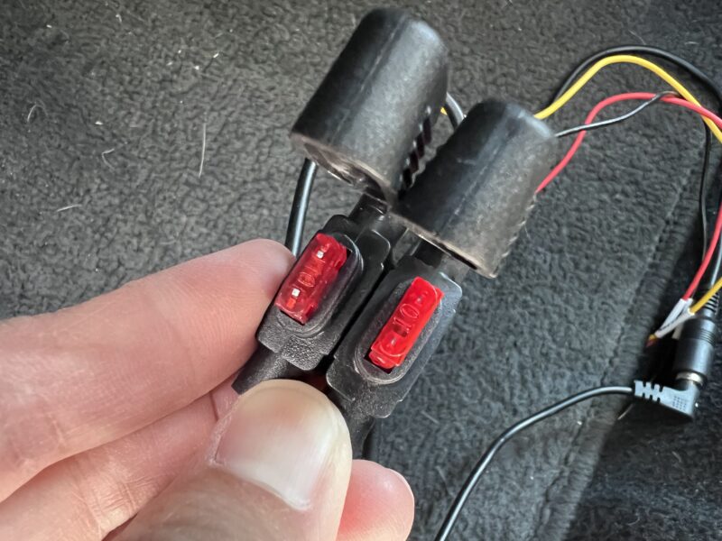 常時及びアクセサリー配線にはギボシが取り付けられており、ヒューズホルダーを用いて、車載のヒューズボックスから電源を取る方式となっています。ヒューズホルダーには3Aヒューズが付いています。