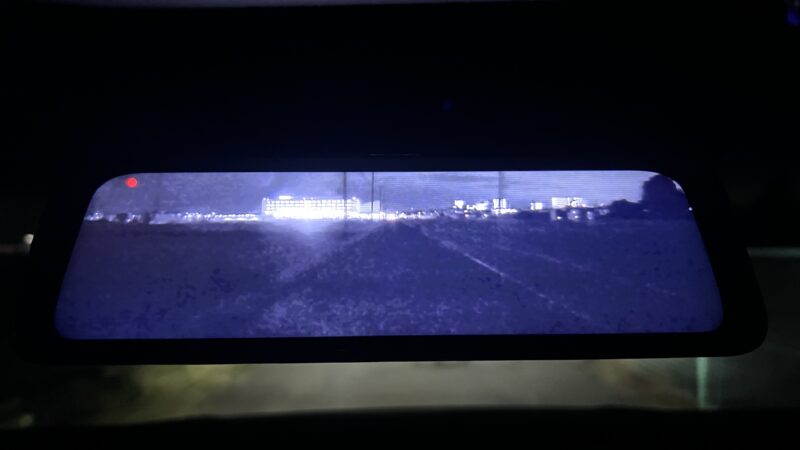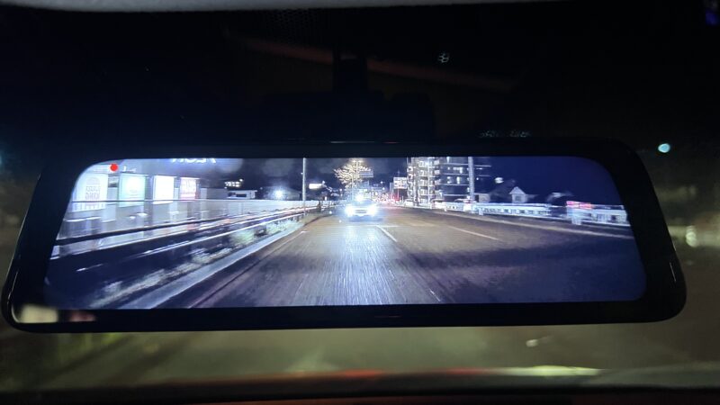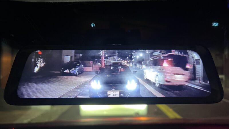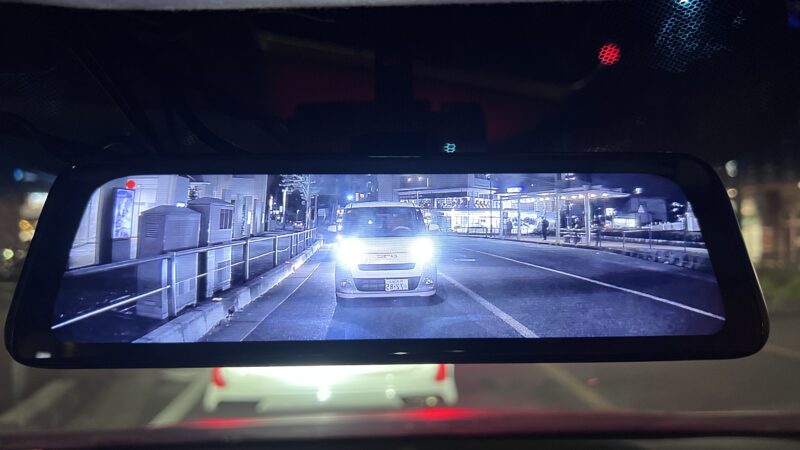 後方車両から照らされているヘッドライトの光は補正されており、防眩効果により、後方の状況はしっかりと目視する事が出来ました。また、それにより、夜間でもナンバー認識が可能でした。